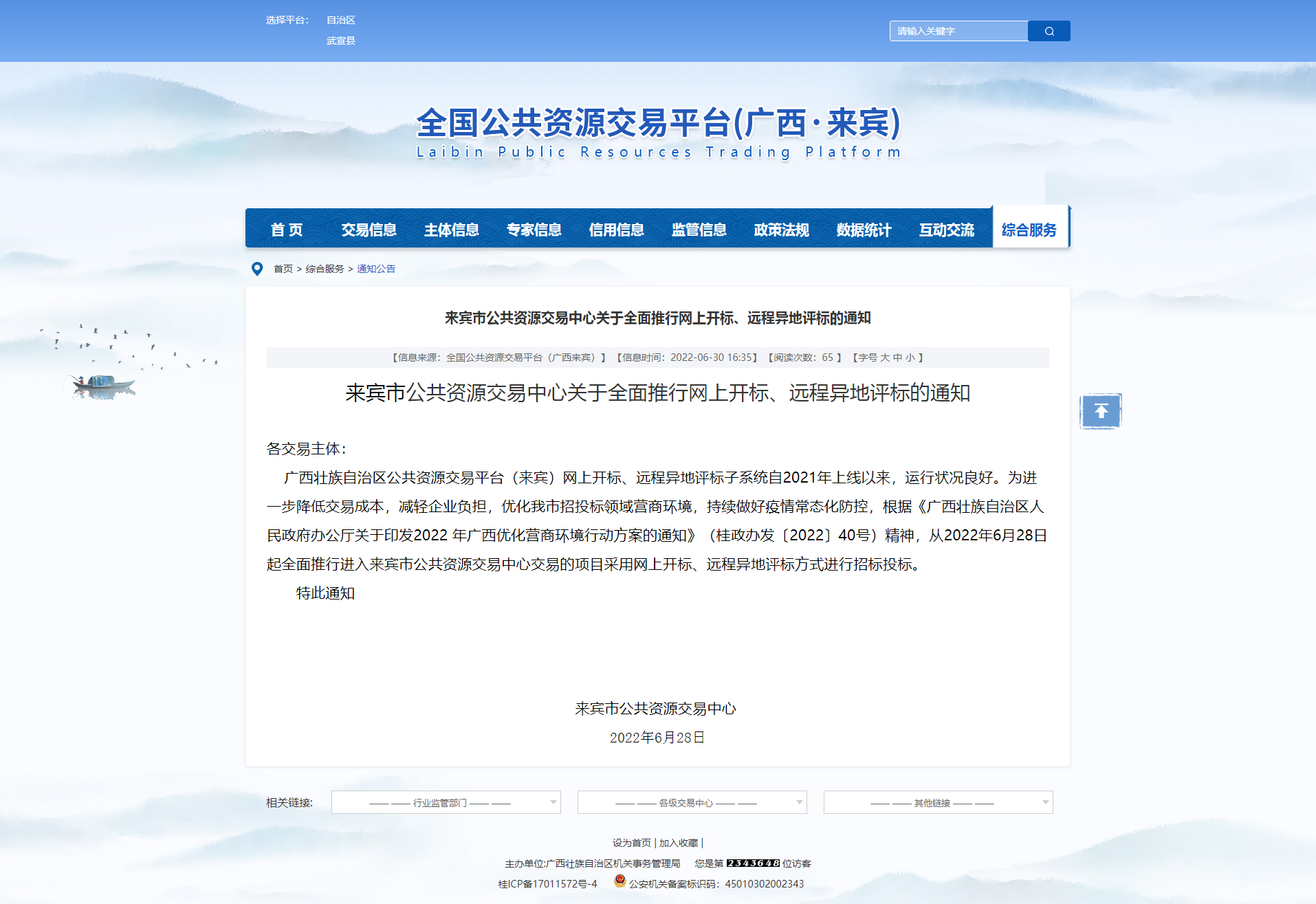 廣西壯族自治區(qū)公共資源交易平臺(tái)(來(lái)賓)網(wǎng)上開標(biāo)、遠(yuǎn)程異地評(píng)標(biāo)子系統(tǒng)自2021年上線以來(lái),運(yùn)行狀況良好。為進(jìn)一步降低交易成本,減輕企業(yè)負(fù)擔(dān),優(yōu)化我市招投標(biāo)領(lǐng)域營(yíng)商環(huán)境,持續(xù)做好疫情常態(tài)化防控,根據(jù)《廣西壯族自治區(qū)人民政府辦公廳關(guān)于印發(fā)2022 年廣西優(yōu)化營(yíng)商環(huán)境行動(dòng)方案的通知》(桂政辦發(fā)〔2022〕40號(hào))精神,從2022年6月28日起全面推行進(jìn)入來(lái)賓市公共資源交易中心交易的項(xiàng)目采用網(wǎng)上開標(biāo)、遠(yuǎn)程異地評(píng)標(biāo)方式進(jìn)行招標(biāo)投標(biāo)。